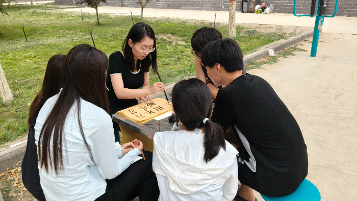 7月22日,服务队抵达麦盖提县和平社区后,立即投入支教筹备工作。团队以“文化润疆”为导向,围绕当地青少年特点,精心设计传统文化体验课程:通过毛笔字临摹感悟汉字之美,借助团扇绘制传递中式美学,以脸谱涂色激发非遗文化兴趣。为确保教学实效,队员们反复推演教学流程,将知识性与趣味性相结合,力求在互动中激发学习热情。