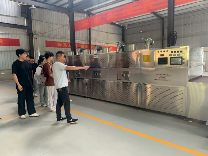 禹山镇茶产业发展迅速,千亩茶园层叠如画。跟随着茶厂老师的脚步,同学们不仅观摩了从采摘、萎凋、揉捻到干燥的全流程现代化制茶工艺,更与坚守数十年的老茶人深入交流,聆听他们如何在一捻一焙之间传递匠心。据介绍,茶厂不仅大面积种植了“黄金茶”“君山银针”等优质品种,还在坚持老手艺的同时引入了微波光波杀青、智能萎凋、自动化揉捻等先进技术,在提高生产效率的同时,极大保留了茶叶的天然香气与营养成分。