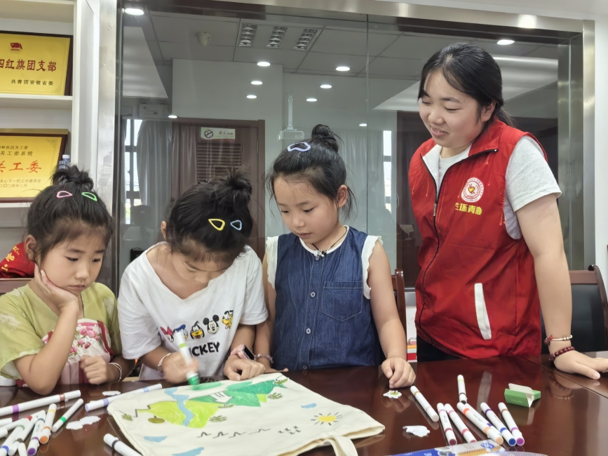 在知识讲解和互动游戏之后,“河小青”团队为孩子们分为五组,并给每组分发了一个空白帆布包和一套绘画工具,邀请他们拿起画笔,在帆布包上画出自己心目中的河流。这个环节不仅是对前面所学知识的一种情感表达,更是让孩子们充分发挥想象力和创造力的过程。