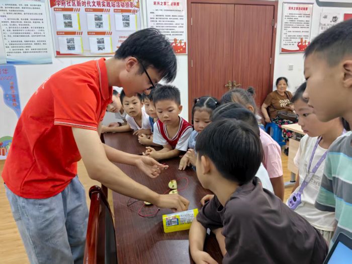 最热闹的当属“水果电池”实验。“土豆里也有能量吗?”拿到土豆时,孩子们举着材料围过来,眼里满是好奇。在指导下,他们亲手将金属片插进土豆,把导线与灯泡连接起来——当微光从灯泡里透出来的瞬间,活动室里炸开了欢笑声。“我的亮了!原来土豆里藏着这么神奇的力量!”一个扎着辫子的小女孩举着自己的“作品”蹦跳着说。旁边的小男孩则皱着眉头研究:“是不是所有蔬菜都能这样呀?”在亲手实践中,孩子们真切触摸到了知识的温度,理论与现实的碰撞让探索的种子悄悄发芽。此刻,不仅是导线与灯泡完成了连接,孩子们的心里也悄然架起了一座通往化学世界的小桥,那份亲手创造的惊喜,成了最生动的启蒙。