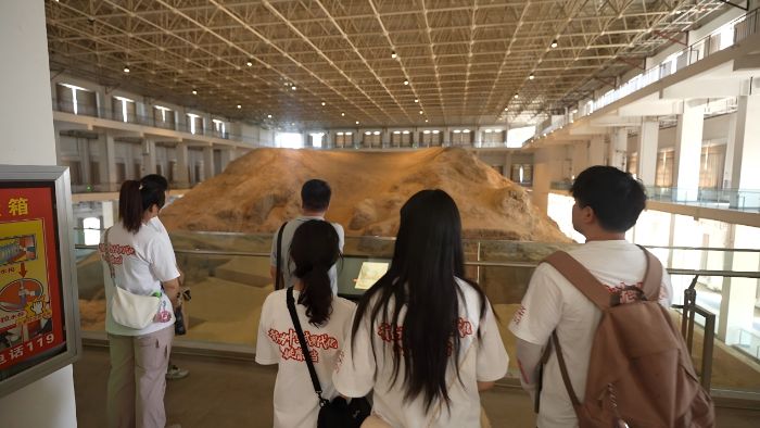 随后,实践团前往丝绸之路北庭故城遗址博物馆继续调研。作为新疆首个以丝绸之路为主题的专题博物馆,设有“丝路传奇”“建政西域”“人文北庭”“北庭重生”四个主题展厅,实践团依次探索。团队成员不仅对相关文献资料进行详细整理与抄录,还参观展厅内的陶尊、鸡首壶等文物,以此深入了解北庭故城的历史。通过数字化展项,借助三维建模、动态投影等技术,看到原本沉寂的故城遗址在屏幕上“复活”,清晰感知到不同民族文化在这片土地共生共荣。