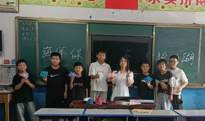8月1日,实践团队员颜淑婷在广西壮族自治区南宁市宾阳县露圩镇星源艺术培训学校,为约20名1至6年级的小朋友开展了海洋保护宣讲课堂。课堂一开始,颜淑婷通过“这是什么海洋生物”的互动游戏迅速调动了小朋友们的积极性。在讲解海洋面临的威胁——珊瑚白化时,小朋友们看到五颜六色的珊瑚变成白色的图片,不禁发出阵阵惊叹。一位小朋友问道:“老师,珊瑚白化后会消失吗?”颜淑婷耐心解答:“它没有消失,但是失去了往日的色彩,也无法再为鱼儿提供栖息之所,很多鱼儿不得不被迫搬家。”小朋友们听后,脸上露出了难过的表情。宣讲课堂快结束时,颜淑婷与小朋友们一同用扭扭棒制作珊瑚,经过一节课的学习,小朋友们对海底宝藏珊瑚表现出浓厚的兴趣,制作手工时格外积极。课堂结束后,实践队员随机采访了几位小朋友,其中一位一年级的小朋友上课非常认真,当被问到如何保护海洋时,她流利地回答:“我们不能在海边扔垃圾,看到海边有垃圾要捡起来。”孩子们的回答虽然简单,却饱含着对海洋的关爱。