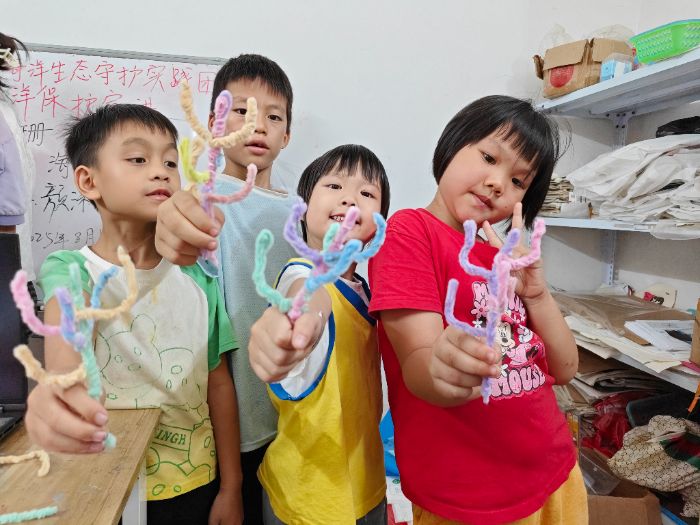 图为小朋友们在展示自己使用扭扭棒制作的珊瑚。颜淑婷供图