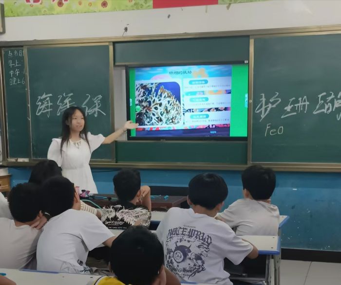 图为实践团队员颜淑婷在为小朋友们开展海洋保护宣讲课堂。颜淑婷供图