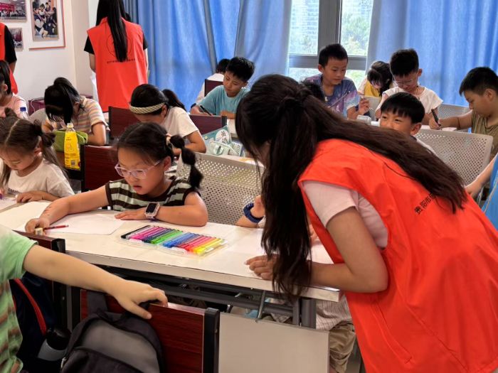 图为实践团队员车舒畅在指导小朋友描绘他心中的海底世界。车舒畅供图