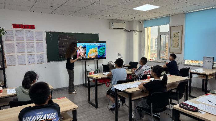 8月15日,实践团队员谢宜瑄在山西省长治市为艺书院,为20名15岁左右的九年级同学开展了一场海洋保护宣讲课堂,课堂伊始,谢宜瑄播放了一系列精心挑选的珊瑚礁视频,画面里色彩斑斓的珊瑚与穿梭其间的鱼群吸引了同学们的目光,本以为九年级学生对珊瑚的介绍会比较平静,可视频刚播放十几秒,前排一位男生就指着屏幕里的鹿角珊瑚惊叹:“这也太酷了,跟外星植物似的!”旁边的女生也连忙接话:“我一直以为珊瑚是海底的石头,原来竟是活的!”现场瞬间热闹起来;讲解到珊瑚白化时,一位女生主动提问:“老师,防晒霜对珊瑚有影响吗?”谢宜瑄立刻结合所学知识,详细解释了防晒霜中氧苯酮等成分对珊瑚的危害,同学们听得十分专注;课堂尾声,谢宜瑄带领大家画珊瑚,鼓励大家自由创作,有个男生在画中给珊瑚礁加了一层亮晶晶的罩子,旁边歪歪扭扭地写着“防污染防护盾”,还特意用红笔标上“100%有效”,满满的守护心意跃然纸上。