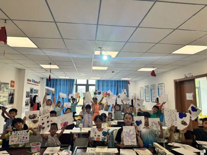 图为海洋保护宣讲课堂结束后小朋友们展示自己的绘画作品。车舒畅供图
