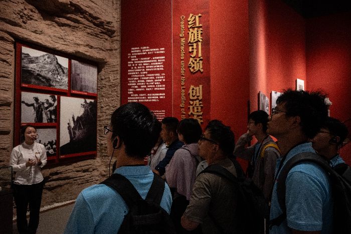 从千年文明的回响中走出,实践团一行来到林州市红旗渠。站在太行山悬崖边,俯瞰那条蜿蜒曲折的“人工天河”,渠水清澈见底,顺着山势流淌,滋养着曾经干涸的土地。“数十年前,这里还是‘十年九旱、水贵如油’的地方。”红旗渠纪念馆讲解员指着一幅老照片说,照片里,林县百姓挑着水桶,在崎岖山路上跋涉,桶里的水仅够一家人一天饮用。走进纪念馆,一组“凌空除险”的场景复原震撼了所有人:几名修渠民工腰系大绳,悬在数十米高的悬崖上,手持钢钎凿石,脚下是深不见底的峡谷。“当时没有安全绳,就用麻绳;没有机械,就靠人力。”讲解员介绍,为了在绝壁上开出渠线,300多名青年组成“飞虎队”,在零下十几度的寒冬里,吊着绳子在崖壁上作业,不少人手上冻裂的伤口沾了泥水,愈合后又再次开裂。实践团成员、地理信息科学专业学生肖扬看着场景里民工们补丁摞补丁的衣服,指尖轻轻划过展柜里的钢钎——钎头早已磨平,却仍能感受到当年挥动时的力量。
