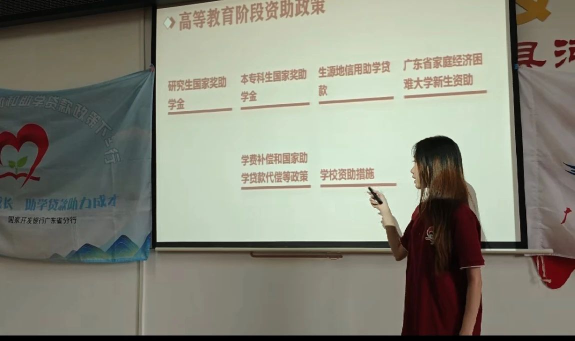 团队宣讲合照 化身“政策翻译官”:案例+乡音让政策“活”起来 宣讲会上,队员们紧扣群众最关心的政策细节展开讲解。其中,队员陈诗颖、刘慧怡围绕生源地助学贷款这一核心内容,进行了细致入微的解读。从贷款期限的年限规定、还款时间的节点提醒,到申请流程的分步演示,再到所需材料的清单罗列,每一项都讲解得清晰明了。为让听众更好理解,她们还结合提前收集的本地家庭案例,用“家长送孩子上学凑学费”的常见场景切入,把贷款利息计算、逾期影响等专业问题转化为“攒钱还账”般的通俗表达,确保在场的学生与家长都能听得懂、记得住,真正让政策内容走进群众心里。