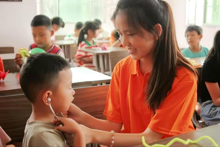 志愿者化身 “知识向导”,带孩子们学习 AI、禁毒与未成年人保护法知识。AI 与健康课堂上,通过 PPT 讲解护眼知识、视频展示护眼食物,趣味提问和听诊器体验激发孩子们的探索欲。上午先以手工互动拉近距离,随后开展禁毒科普,志愿者揭秘毒品伪装术;下午,动画 PPT 让未保法知识变得生动,问答互动和拍手歌让法律知识扎根孩子心间。