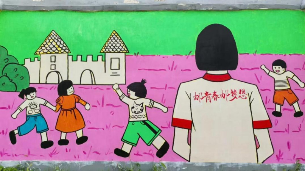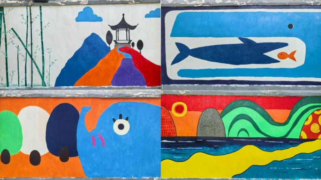 3.墙绘传情乡野焕彩 团队的实践延伸至课堂之外。成员们将环保理念融入艺术创作,精心绘制了五幅主题墙绘。成员们以斑驳墙面为画布,将生态保护的深刻理念、乡村美育的实践探索与支教行动的温暖成果熔铸于笔墨色彩之中:翠竹摇曳、远山含黛、古亭矗立的画面,晕染着中国传统美学的雅致韵味,让乡村文化氛围在艺术浸润中愈发醇厚;海洋生灵嬉戏共生的图景将海洋生态保护的重要性娓娓道来;憨态可掬的大象与自然相融的形象,巧妙传递着人与自然和谐共生的美好倡议;支教师生相拥欢笑的场景被定格,成为乡村教育振兴路上闪光的记忆碎片;铺展开来的斑斓山水画卷,则与“绿水青山就是金山银山”遥相呼应,生动勾勒出车门乡生态宜居的美丽乡村新貌。这些墙绘将成为乡村传播环保理念的生动载体,助力深化应对气候变化、保护地球生态环境、促进人类社会可持续发展的实践。