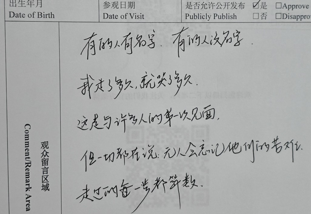 随后,团队重点观察并记录了纪念馆出口处游客留言簿的内容。留言簿上汇集了来自全国各地、不同年龄层参观者的心声。队员仔细翻阅,摘录了部分具有代表性的留言,如“‘历史不是用来被原谅的,而是用来被记住的’——一位中学生”、“‘愿世界和平永驻,悲剧永不重演’——河北游客”等。这些朴素的文字,反映了公众对历史的铭记和对和平的珍视。这些留言让队员们感受到铭记历史、珍爱和平已成为广泛的社会共识。