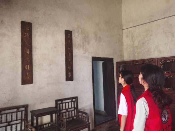 图十一实践团成员研读学习杨立三故居堂屋悬挂的木刻对联 安婷婷摄