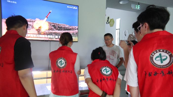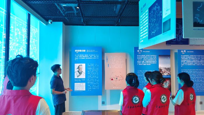 在专业讲解员的带领下,实践团参观了天文台的各个功能区。讲解员介绍“‘茶观天象’金井天文台,拥有省内最大的光学天文望远镜,这是目前中南五省对公众开放的最大的天文望远镜,最远可以观测到86亿光年左右的类星体。”金井天文台门口摆放着一套橙黄色的服装,据了解到这是前苏联第一次登上月球的宇航服款式,是中国早期探索高层空间时保护飞行员安全的装备。此外,金井天文台拥有湖南省最全面的陨石收藏,共15块陨石。在工作人员的带领下,实践团成员还使用望远镜亲自体验了近距离观测星系。