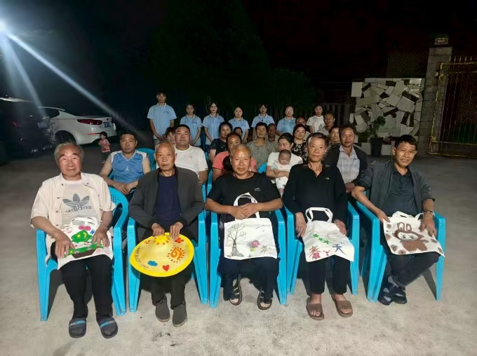 当晚,实践队在村文化广场举办了一场别开生面的普通话教学与互动活动。活动以“学语言·传文化·共欢乐”为主题,设置跳大绳、唱红歌、猜字谜、击鼓传花、打羽毛球、跳广场舞等游戏环节,将语言学习与趣味互动紧密结合。村民们积极参与,现场气氛热烈,欢声笑语中,普通话的交流应用自然融入游戏场景。为激励参与,实践队精心准备了草帽、帆布包、文具、故事书等实用奖品,到场村民均可获得一份,进一步激发了村民的学习热情。活动结束后,村民代表表示:“这样的活动既学到了知识,又增进了邻里感情,希望以后多举办!”