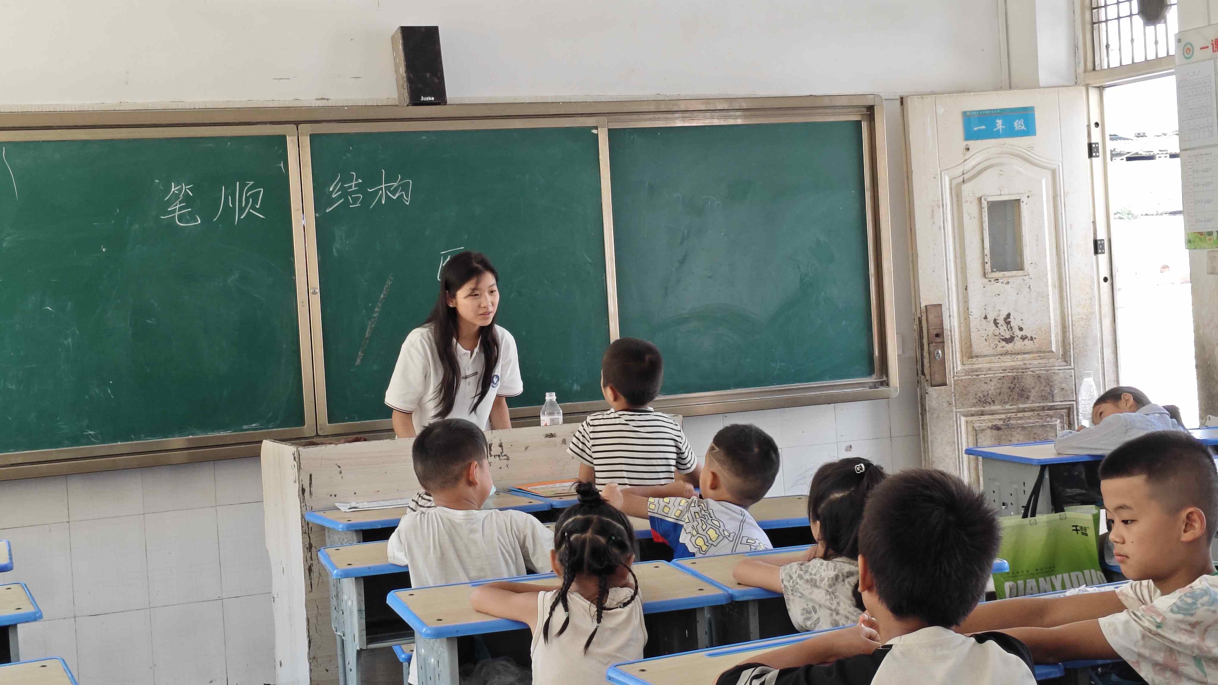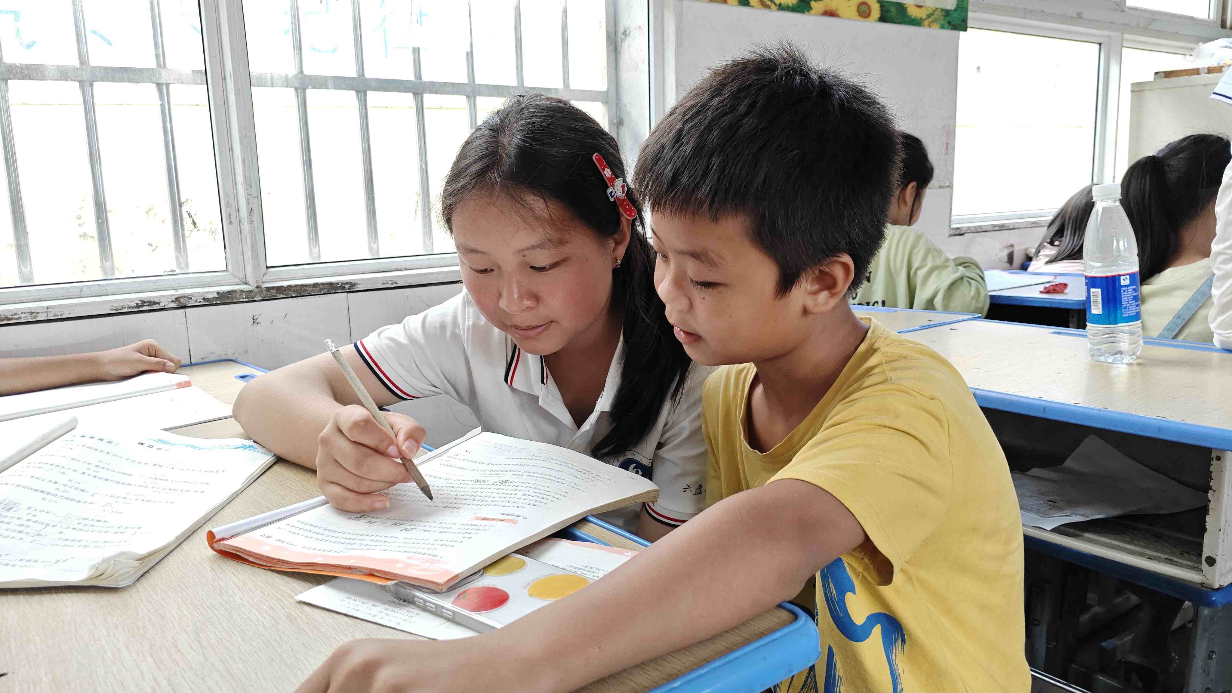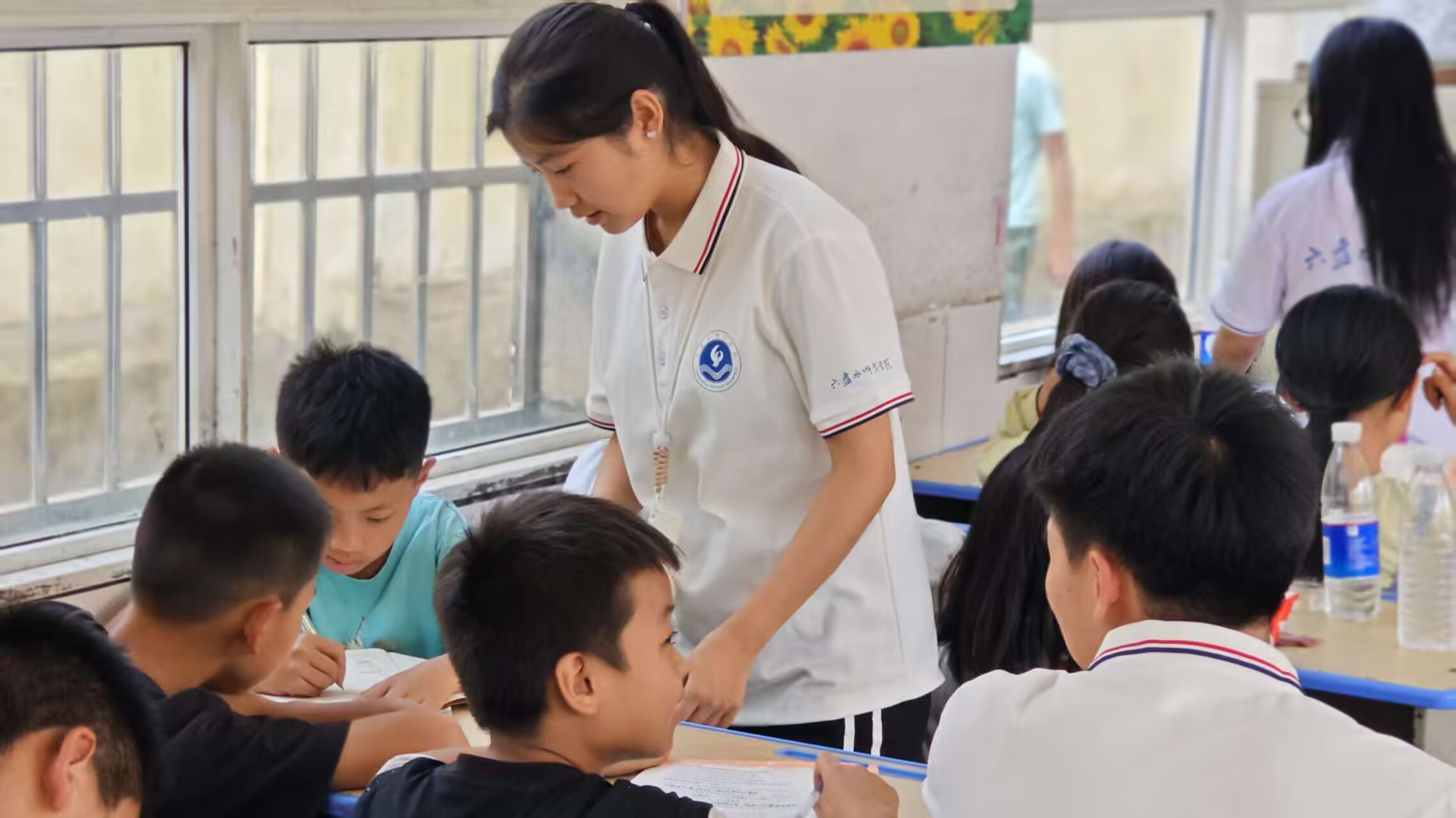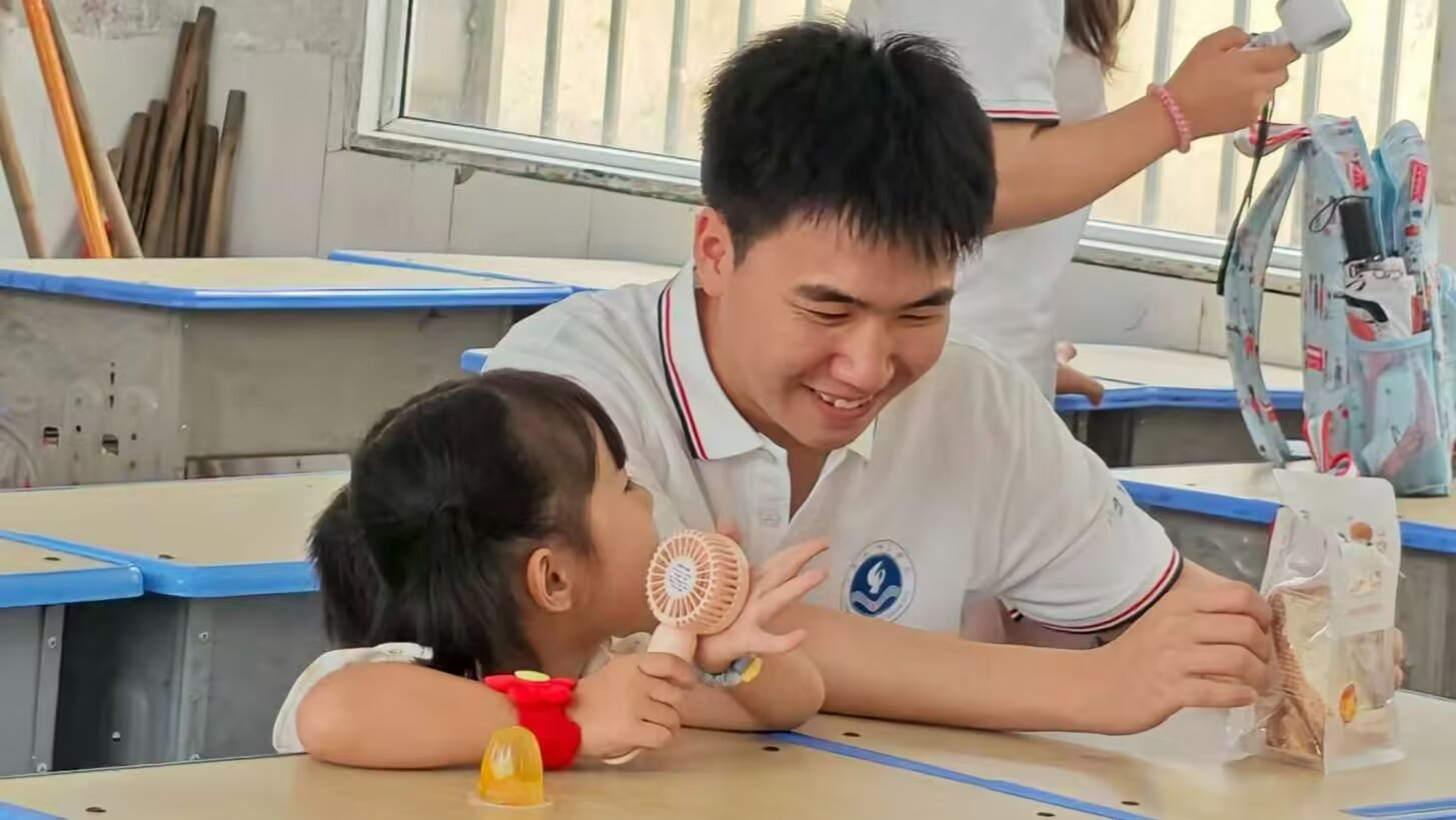 图为最后一堂课,志愿者在教室里辅导同学完成暑假作业,助力他们巩固知识。通讯员汪永站 摄