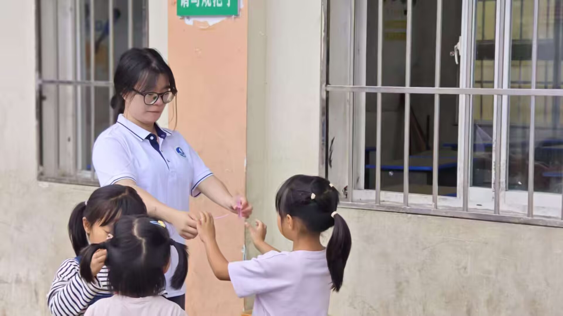 图为细心的志愿者主动走到小同学身边温柔地照顾着她。 通讯员李华欢 摄