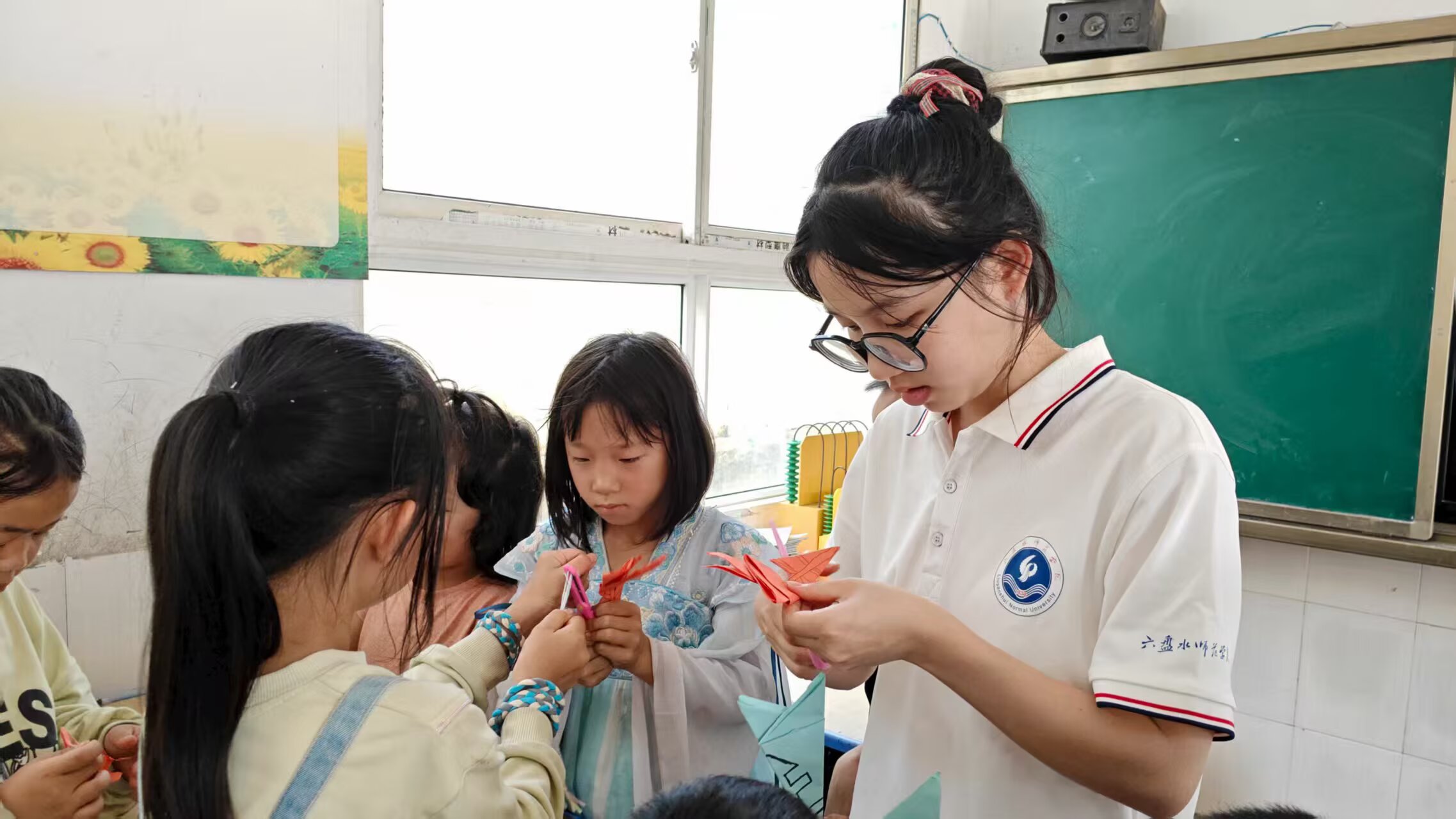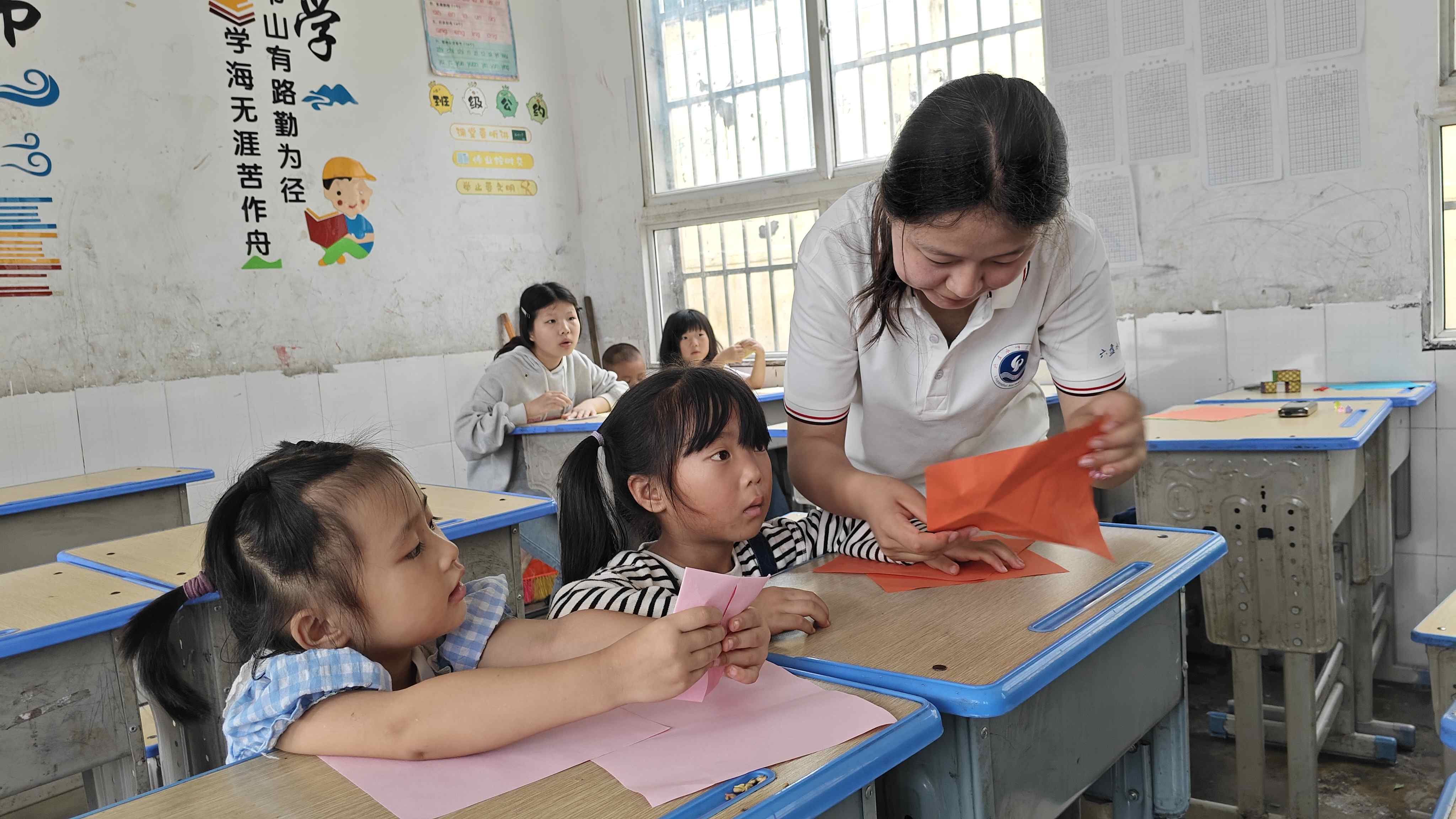 图为手工课上,志愿者耐心指导,同学们在妙手生花的折纸课上折出了一个个精致的作品。 通讯员王静月 摄