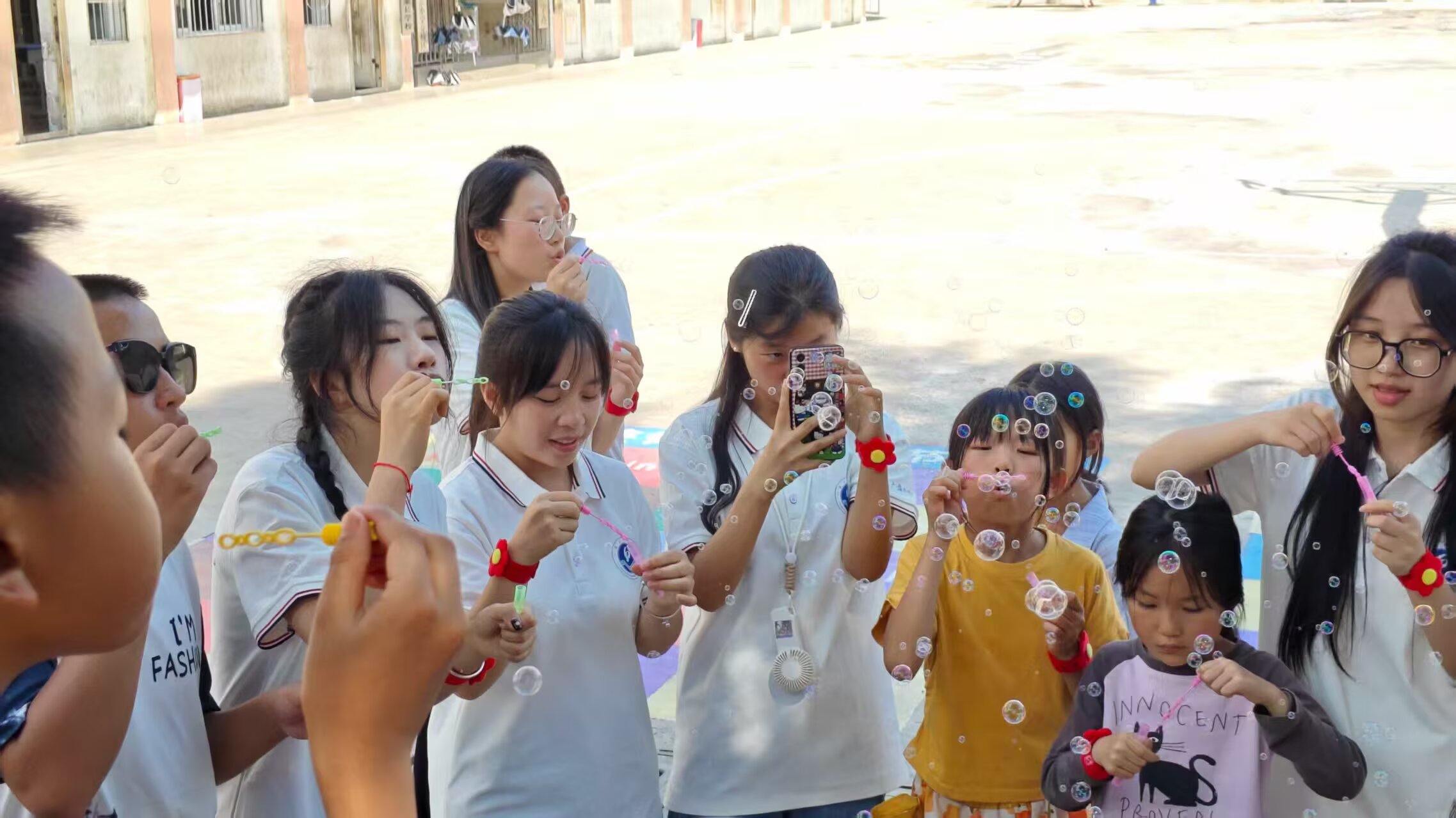 图为校园的操场上,学生与志愿者一起快乐地吹着五彩的泡泡,泡泡在阳光下轻盈飞舞。 通讯员张晏楺 摄
