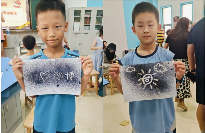 志愿者们提前准备好维C溶液,小朋友们用棉签小心翼翼涂纸,看着纸面被维C水透过,专注地在纸上画图案,有的画星星,有的写“科学超好玩”,写完后小朋友们都好奇地问“接下来会怎样”。这时一旁的志愿者开始拿着提前稀释好的碘伏溶液往纸上喷,整张白纸几乎都变了颜色,但是写字的地方却维持原状,而且小朋友们的字也显现出来了,小朋友们惊喜得拍手,围着志愿者们追问原理。这时志愿者老师解释说维C的还原性让碘单质“变色”,他们像发现宝藏,高兴地拉着同伴分享。