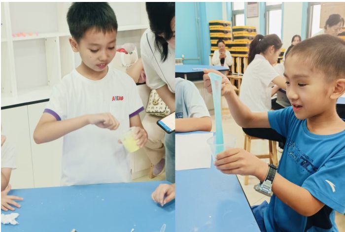 小朋友们围在桌前,盯着白胶、清水等材料,眼睛里满是期待。按照步骤,把白胶和清水1:1混合,加入洗洁精和甘油后,就开始使劲搅拌。有的小朋友力气小,搅拌得脸蛋通红,却一刻不停,嘴里念叨着“怎么还不起泡呀”。等搅拌到起泡,倒入硼砂溶液时,大家又紧张又兴奋,小心翼翼倒着、搅着,看着胶体慢慢变稠。做成后,小朋友们迫不及待伸手去扯,感受气泡胶的弹性,有的把它拉得老长,像拉面一样,笑着喊“看我的超级长面条”;有的使劲揉捏,听胶体发出“咕叽咕叽”声,乐得直拍手。有弹性是因为硼砂和胶水形成了交联结构,把普普通通的材料变成有趣的小玩具。小朋友们玩得停不下来,你拉我的、我揉你的,满屋子都是欢快的笑声,沉浸式感受自制气泡胶的奇妙,在摸、拉、吹中,把科学原理变成了实实在在的快乐。