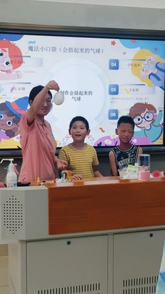 会膨胀的气球实验中,实践团成员按流程向气球内加入柠檬酸、碳酸钠和水,系紧气球后,邀请孩子们进行捶打操作。此时,气球会迅速膨胀。该实验将抽象的化学反应具象化,通过气球膨胀这一明显现象,让孩子们切实感受到化学反应的发生及所产生的气体力量,加深对化学反应原理的理解。