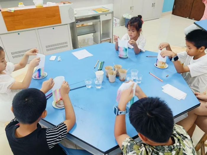 彩虹杯实验中,实践团成员为孩子们分发透明杯、食用油、清水及多种颜色色素。实验操作步骤清晰,先向油中滴入色素,再倒入清水。在此过程中,色素会如坠落的物体般向下沉降,进入水中后逐渐晕开形成彩色圆圈,最终在杯中呈现出层次分明的“彩虹”效果。该实验以直观可见的现象,让孩子们清晰认识到不同物质间的密度差异,有助于激发对物质特性探究的兴趣。