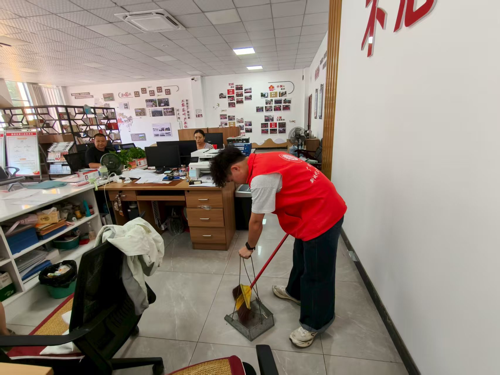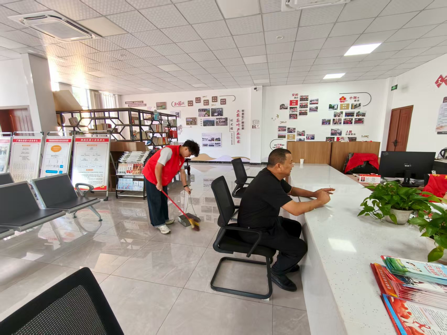 “红心净卫”实践队员深入党群服务中心开展个人社会实践8月20日,“红心净卫”社会实践团队的成员、大学生志愿者钟明江在家乡市重庆市荣昌区广顺街道工农茶叶产业社区党群服务中心成功开展了一场个人社会实践活动。在半天时间里,他独立完成工作区清洁、图书整理、座椅摆放、地面打扫等服务内容,以实际行动改善公共环境,践行志愿服务精神,并在活动结束后与区人大代表张银兵进行深入交流。