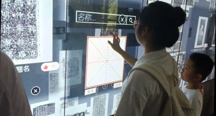 (图为广西师范大学桂韵罗盘实践团成员在桂海碑林体验碑文电子屏。蒋秋杏供图)