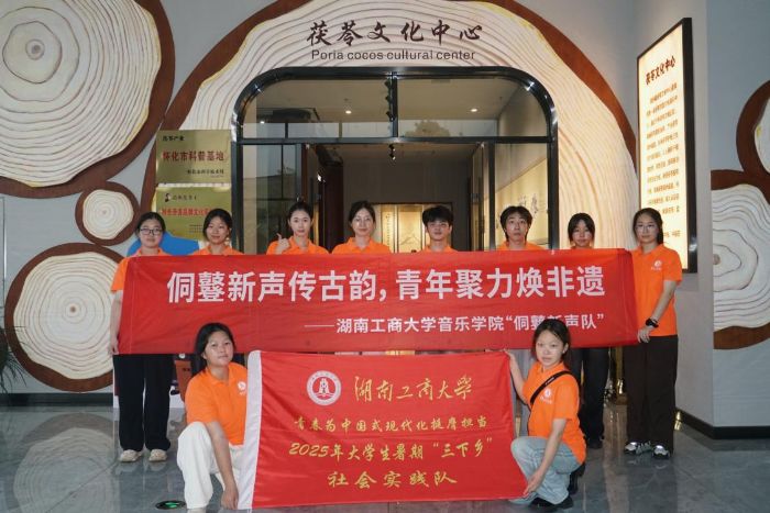 7月14日,湖南工商大学音乐学院“侗鼟新声队”前往靖州苗族侗族自治县,以“红色文化探访+特色产业调研”为主题展开采风。队员们先后走进新厂战役旧址群与茯苓加工贸易中心,在追寻红色足迹、探访产业发展的过程中,触摸当地文化底蕴,于历史与现实的呼应中厚植家国情怀,明晰青年担当。