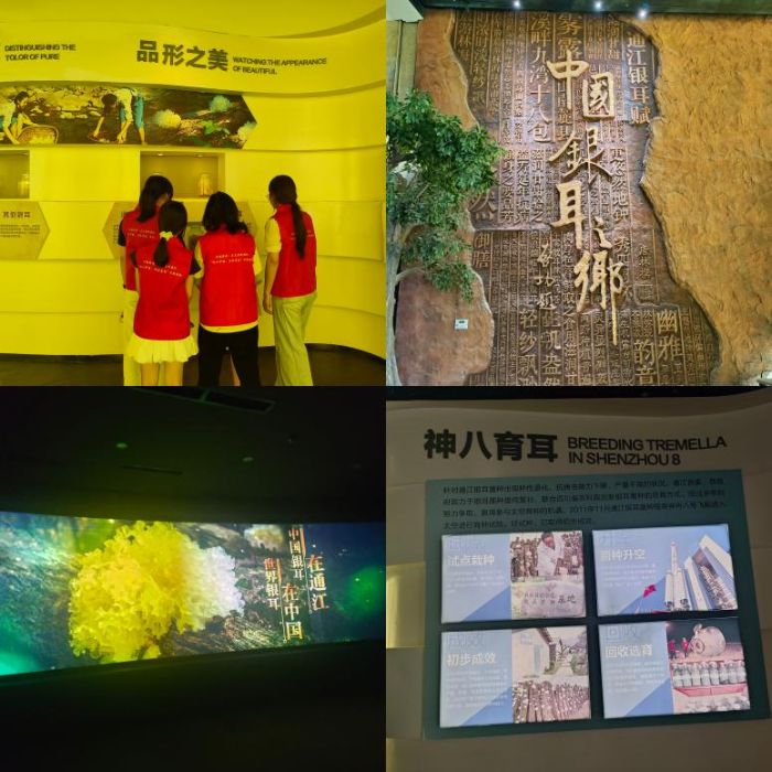 产业调研:从银耳产业看乡村振兴实践 团队最后一站走进通江银耳博物馆,调研当地特色产业发展情况。馆内展品系统呈现通江银耳的发展历程:从依赖野生采集到研发“五改技术”实现人工调控,从传统木段栽培到现代化大棚规模化种植,尤其是2011年银耳菌种搭乘神舟八号升空育种,后续形成“太空银耳”产业,成为带动村民增收的重要项目。队员通过4D影院观看银耳生长过程影像,直观了解科技创新对乡村产业发展的推动作用,进一步理解“自力更生、艰苦奋斗”红色精神在当代乡村振兴中的实践意义。