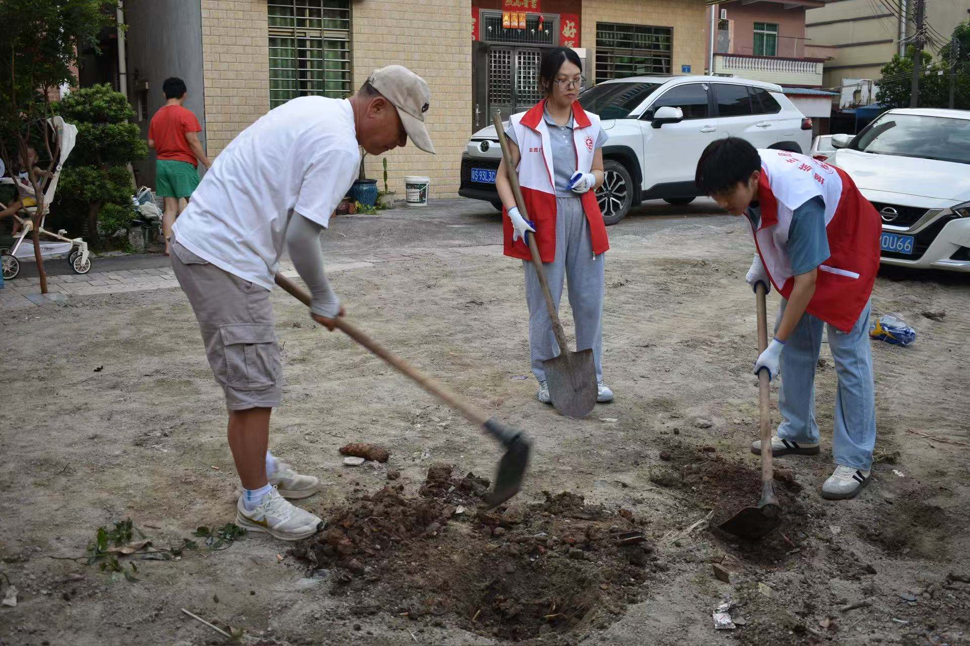 午后时段,南粤青创实践团聚焦乡村绿化提升工程,有序开展路边植绿行动。坑已备好,大家轮流扶苗、培土、浇水,铁锹插入泥土的声响,像是为新生的绿意敲下奠基的鼓点。