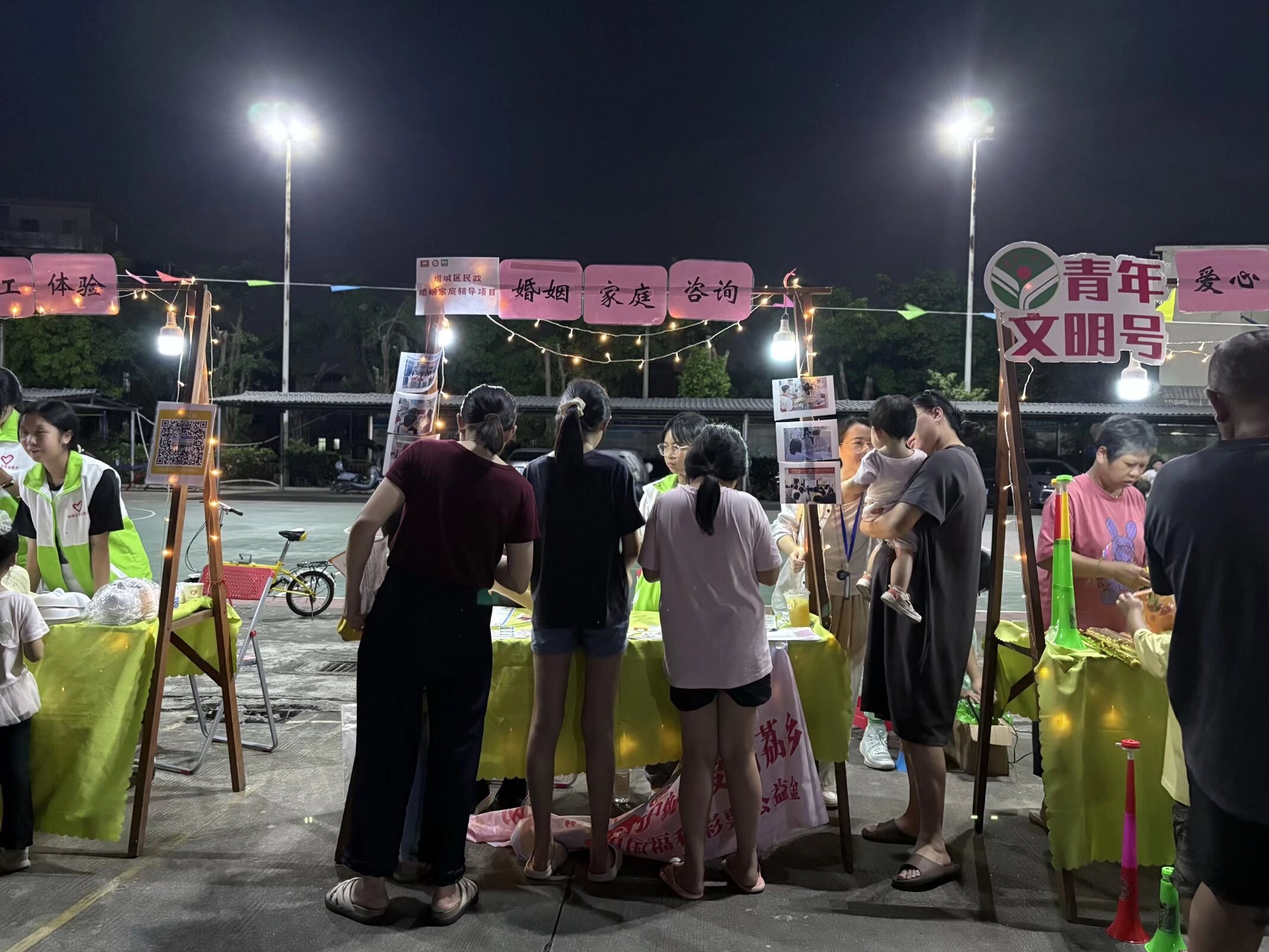 台下,摆摊活动同样如火如荼——有人围坐在一起,专注地制作手工帽子、面具,指尖流转间凝结着巧思;也有人在七夕针织物摊位前驻足挑选,让这份带着温度的手艺成为节日的信物。