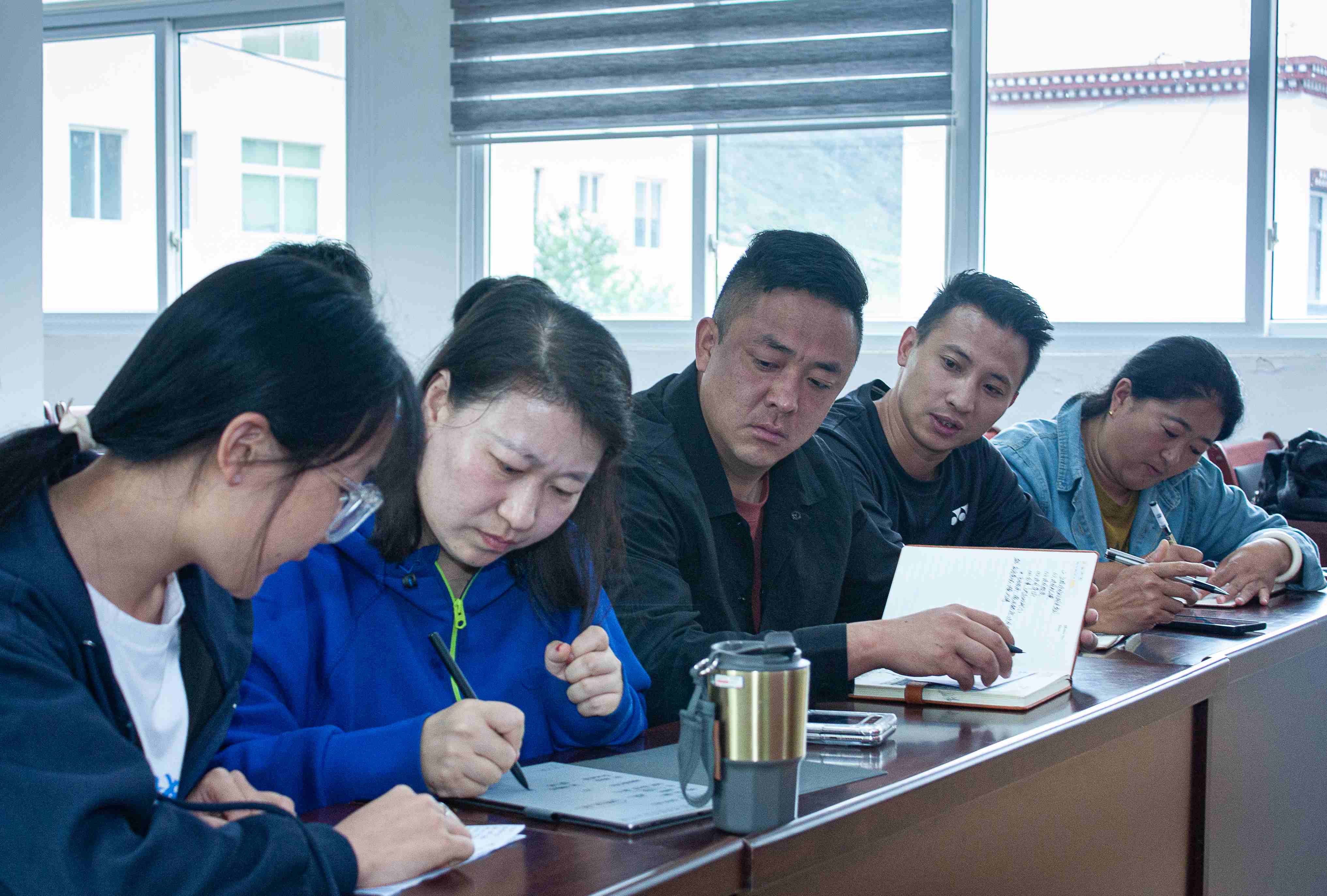 图为推普小队队员向镇政府相关领导讲解创作思路。前排左一为香巴拉镇党委书记尼庆禛。图为王律皓 供图
