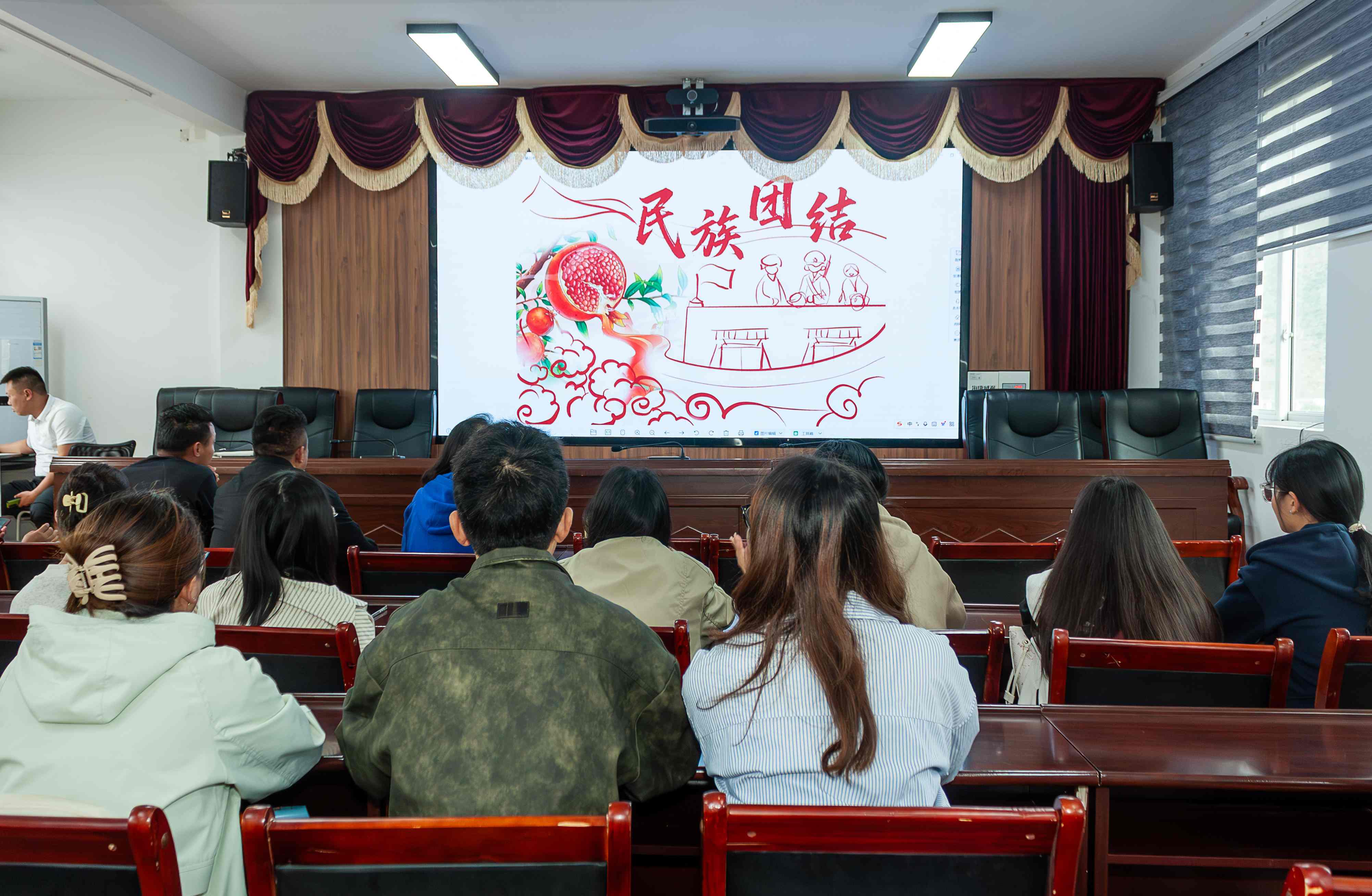推普小队首先向香巴拉镇人民政府汇报了近期完成的墙绘作品设计思路。本次墙绘设计以“当地婚俗”“民族团结”“乡村振兴”和“红色故事”为主题,旨在通过视觉艺术创作展现香巴拉镇的文化底蕴和光辉历程。队员逐一讲解每幅作品中藏着的香巴拉故事。