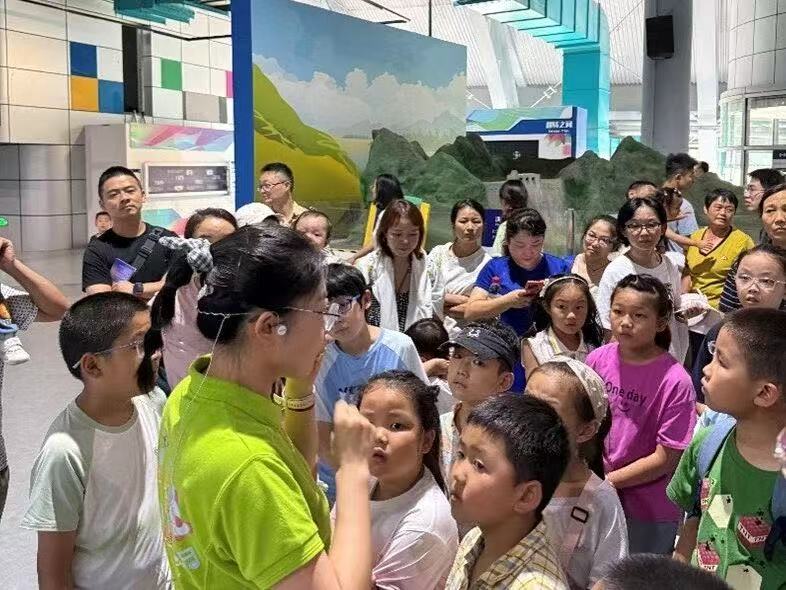 下午,实践团成员与研学亲子家庭在科技馆工作人员的带领下,依次参观了多个主题展厅。展厅内容涵盖基础科学原理、前沿技术应用、与人类文明进程,形成一条连贯的科普体验线路。在互动展项前,大家亲手操作、直观感受;在仿真场景中,沉浸式体验科技与自然交融的奇妙。孩子们围绕展品踊跃提问,团队成员则结合传媒专业视角,记录讲解过程与现场反应。通过这场沉浸式的科普之旅,书本中的知识变得可触、可感、可对话,科学的种子也在一次次惊叹与思考中悄然播下。