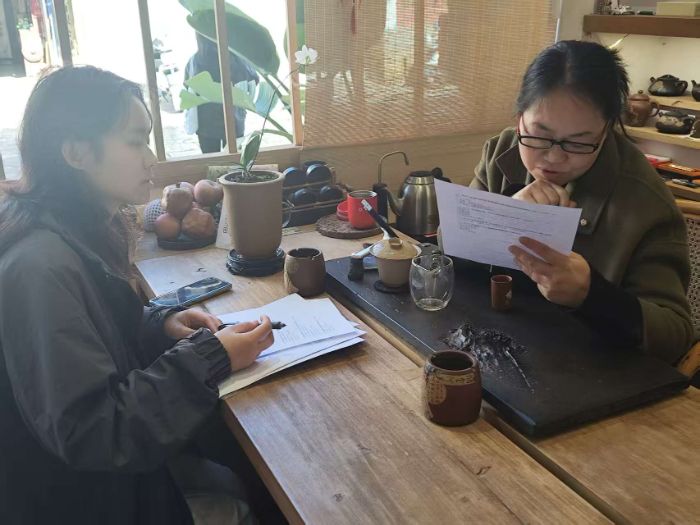 谈及行业困境,陈女士直言:“建水紫陶正卡在‘传统’与‘现代’的夹缝中——老匠人守着技艺不肯变,年轻商家想创新又没手艺,即使电商平台有流量,大家也接不住。”队员们结合调研数据当即给出建议:“不妨做‘轻非遗’试点,将传统刻花简化成线条纹样,打造适配上班族的马克杯,既保留紫陶的泥料特性,又贴合现代生活场景。”