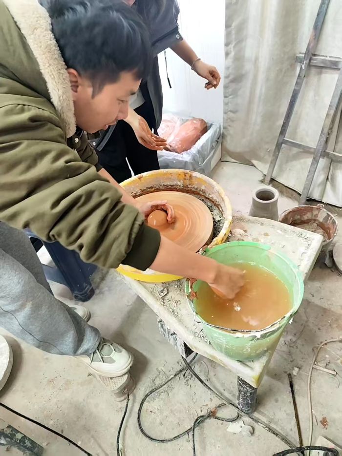 活动伊始,团队走进建水紫陶产业学院实训工坊,紫陶学院教师杨智鸿正在陶轮旁揉泥——手掌按压的力度、手指弯曲的角度,让一块松散的红泥在旋转中逐渐聚成圆柱。“拉坯讲究‘稳、准、柔’,你们看这泥的湿度,差一点就粘轮,再差一点就裂。”杨老师捏起一小块泥演示,队员们纷纷围上前,轮流把手贴在陶轮上感受转速。团队成员杨素影初次上手,泥坯刚拉出杯口就“塌了腰”,杨老师伸手扶住她的手腕:“不是捏,是‘托’,轻了立不住,重了就碎了。”经过老师的不断指导,成员们终于做出几个歪扭的杯坯。