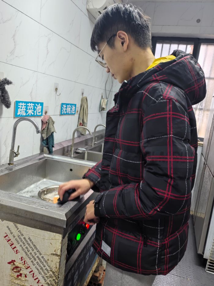 图为实践团成员在敬老院后厨擦拭水池。通讯员施靖烨 供图