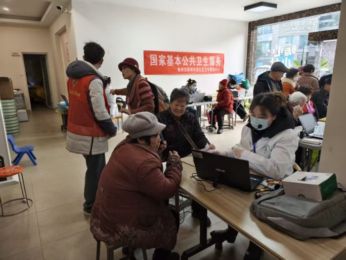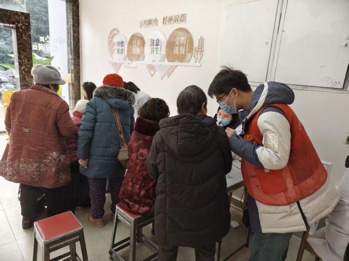 图为实践团成员在协助医生体检老人身体状况。通讯员施靖烨 供图