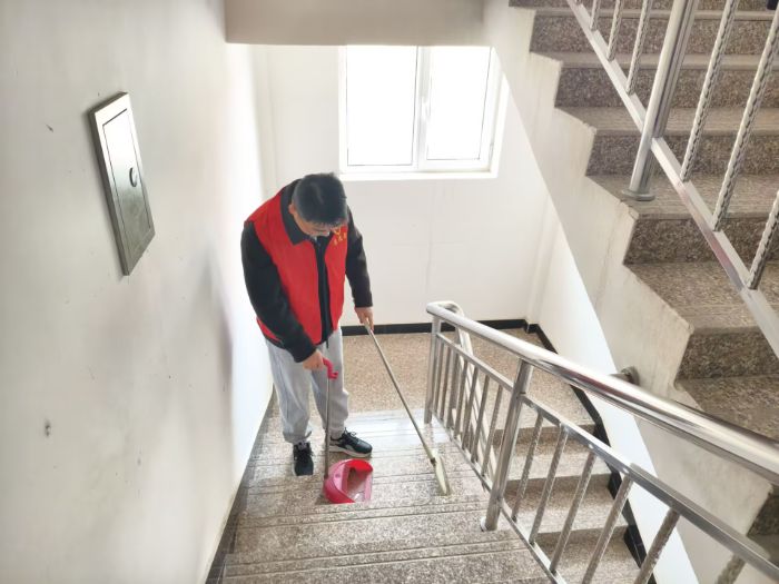 图为实践团成员在社区楼道里清扫楼梯。通讯员施靖烨 供图