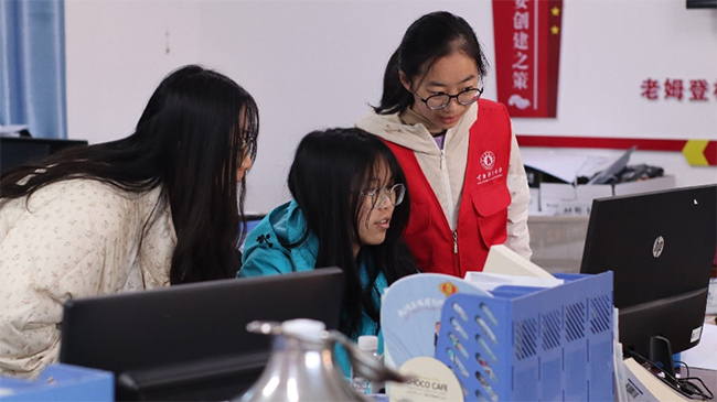图为队员与姐妹花客栈四姐进行交流 赵怡萱 摄
