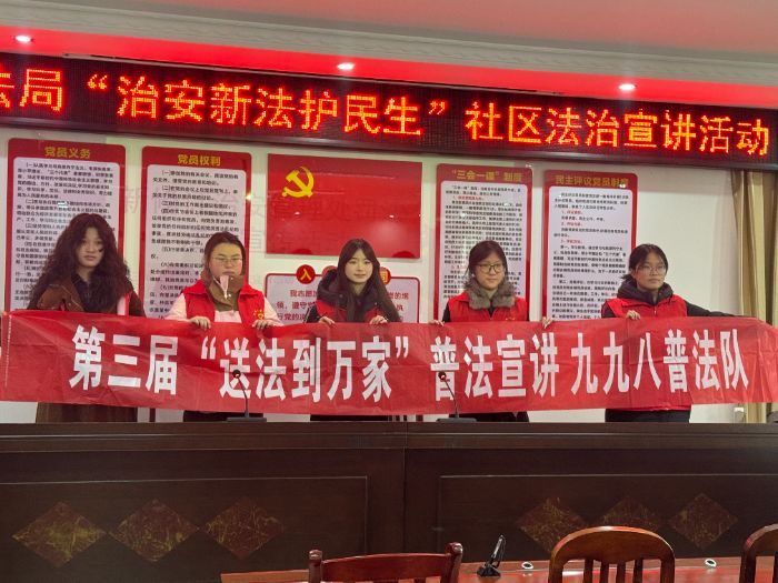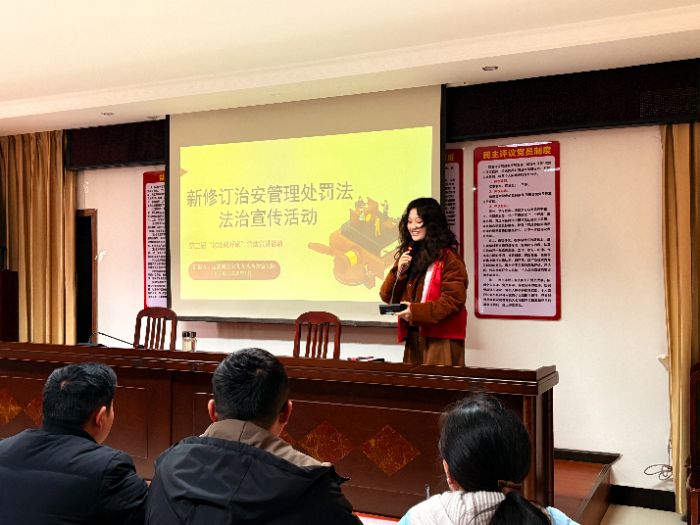 九九八普法队讯(通讯员 李慧 严青秀)为深入贯彻《中华人民共和国治安管理处罚法》,切实提升社区居民的法治素养与自我保护意识,2月5日,湘潭大学“送法到万家”普法宣传志愿者团队走进恩施市五峰山社区,开展“新修订治安管理处罚法”主题宣讲活动。大学生宣讲员刘晨璐担任主讲人,为现场社区居民带来了一堂生动且实用的法治教育课。
