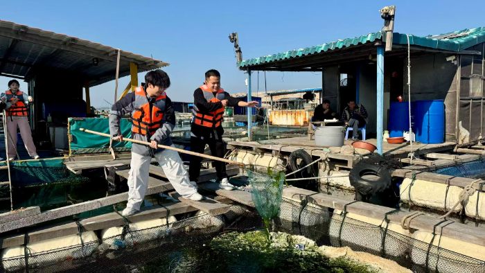 在澳角村渔排上,实践队开启随行直播。队员们全程体验捕捞过程,与渔民亲切交谈,实时分享渔获盛况与劳作日常,生动展现东山岛海洋文化与渔民风情,同时穿插海产供应链基础知识讲解,让网友直观了解渔获流转全过程。直播后,团队及时整理数据、剪辑宣传短片,助力当地文旅推广。