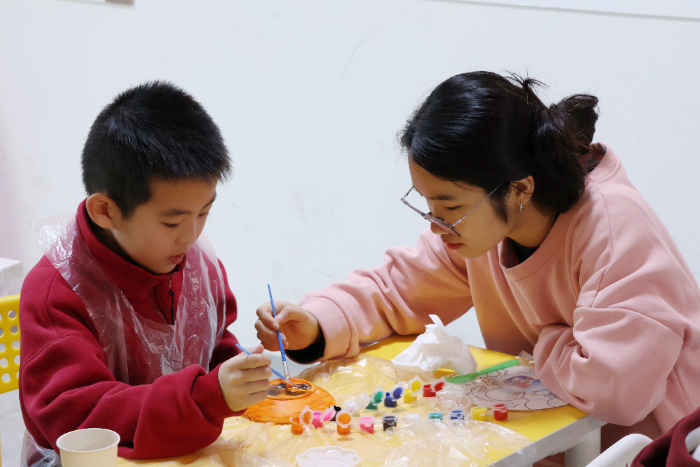 冬令营中,团队成员指导困境儿童进行手工绘画创作 王雅溶 供图