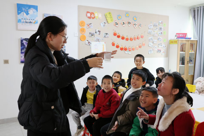 冬令营中,团队成员带领困境儿童开展科学小实验 王雅溶 供图