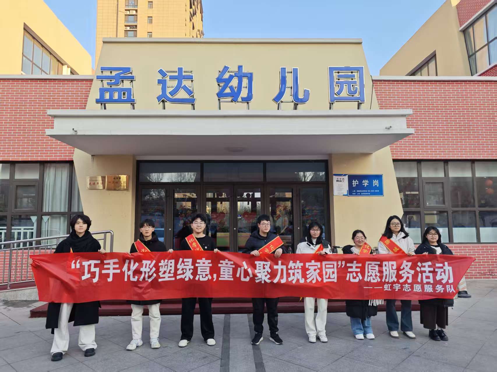 志愿者在孟达幼儿园前合影留念