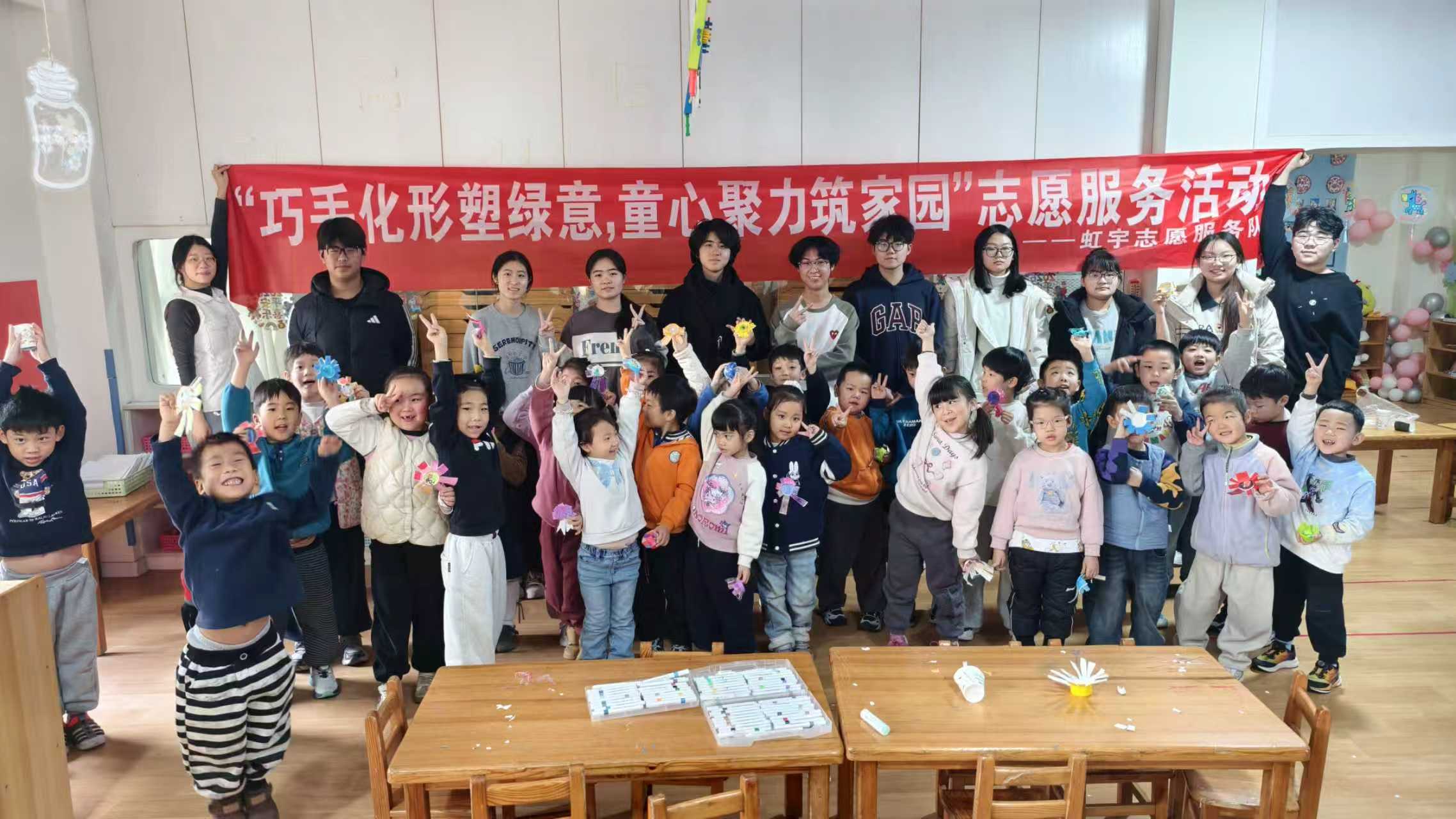 志愿者与小朋友们一起完成手工
