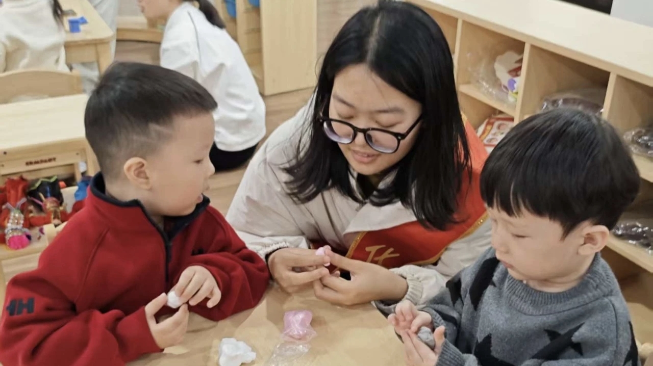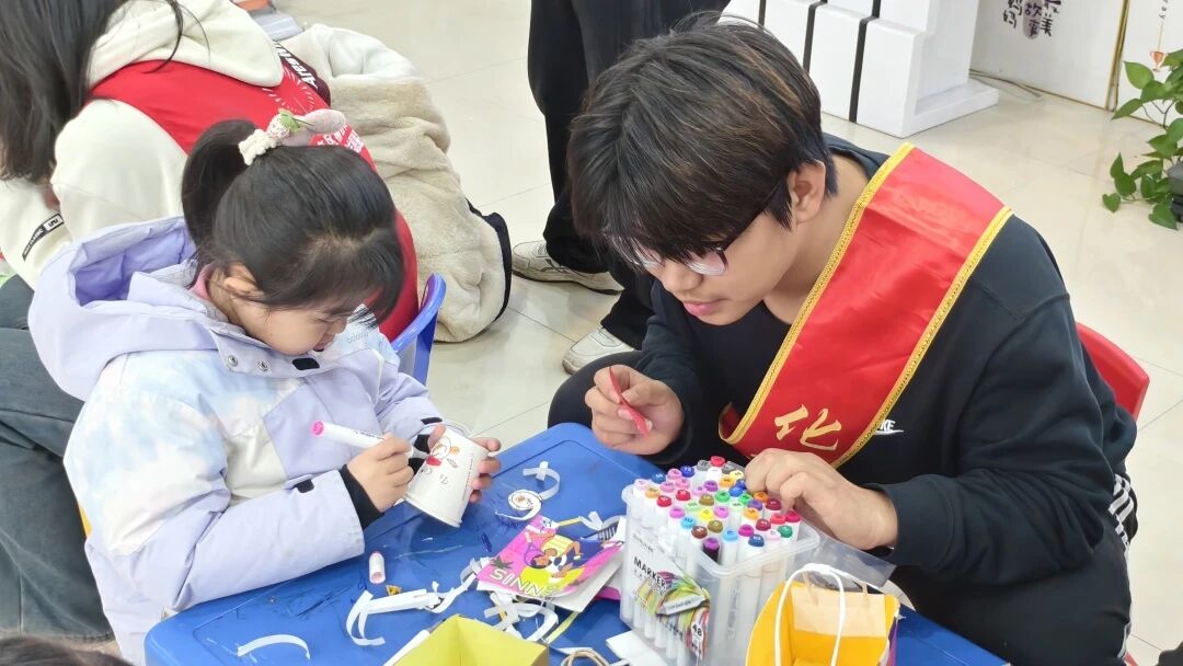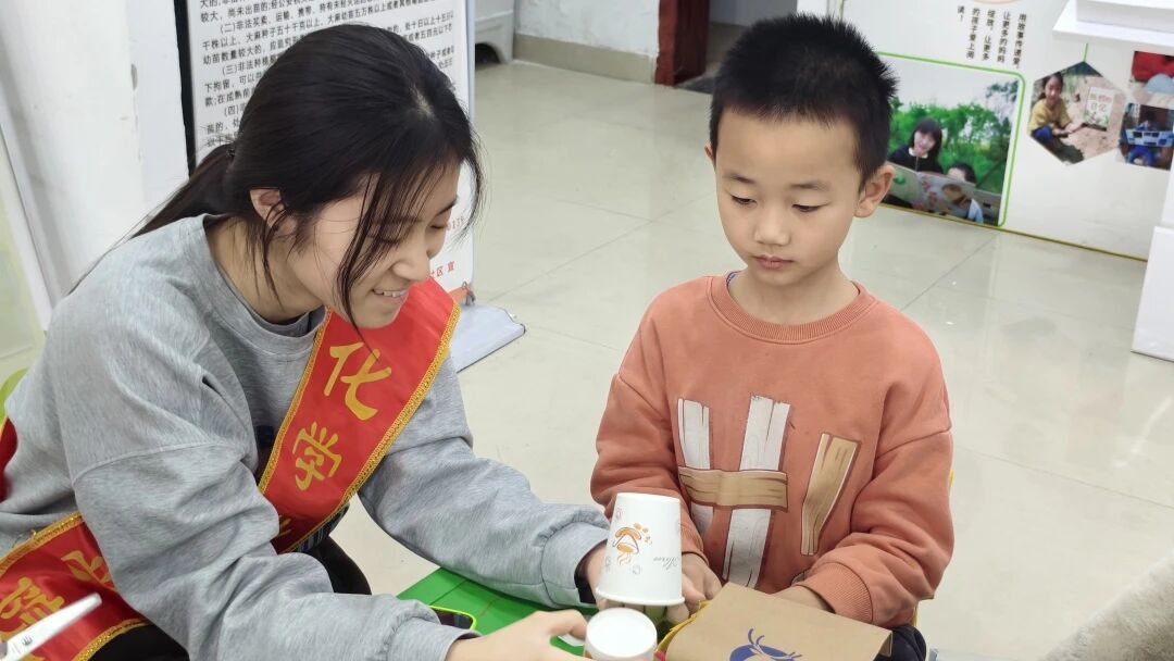 志愿者指导小朋友完成手工