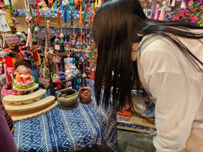 在南宁三街两巷历史文化街区,青砖骑楼与非遗业态相映成趣。团队穿行于古巷院落,寻访麽乜文创小店与非遗展示点位,直观感受古老香囊如何融入城市文旅、走进日常消费。在这里,麽乜以挂件、配饰、伴手礼等年轻化形态呈现,传统纹样与现代审美相融,让大家看到非遗在都市场景中的活态传播与时尚转化,读懂文化传承的当代路径。
